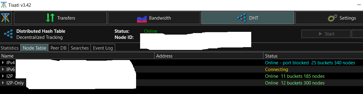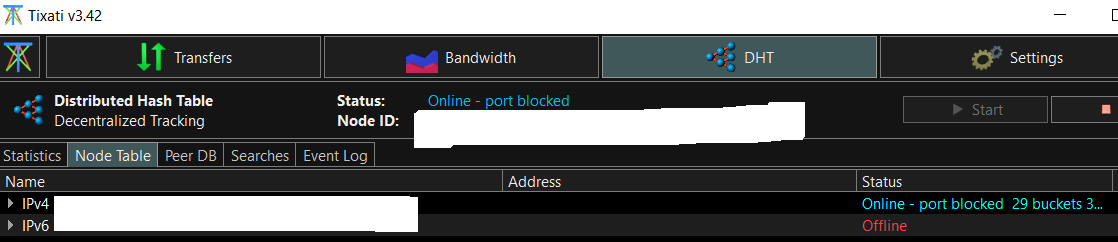e) Have you mis-configured something to block the Tixati port, and forgot about it? Go to settings, reset the DHT ID, change main network port, (stop the client to be 100% sure, wait for 5-10 minutes, then start again).